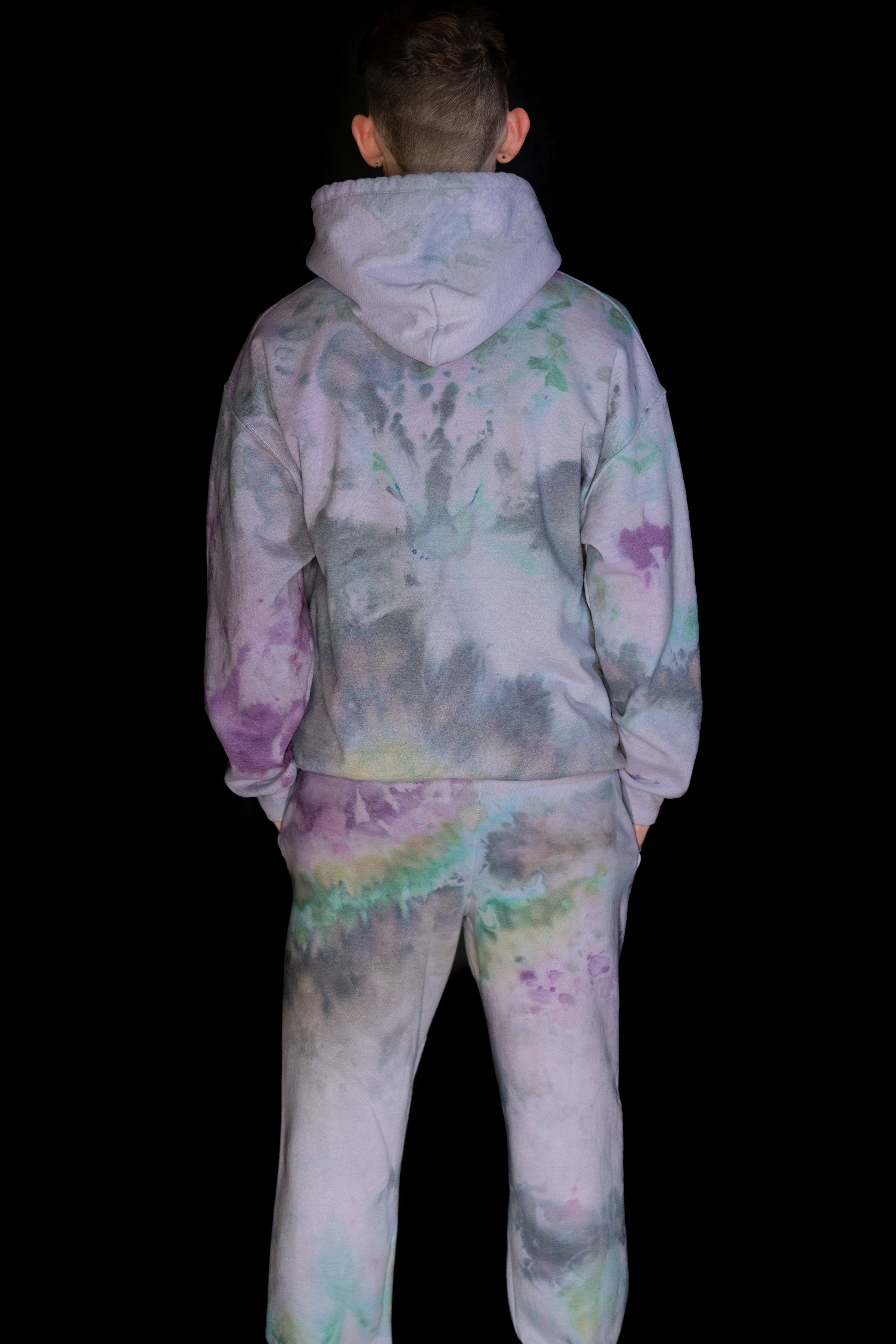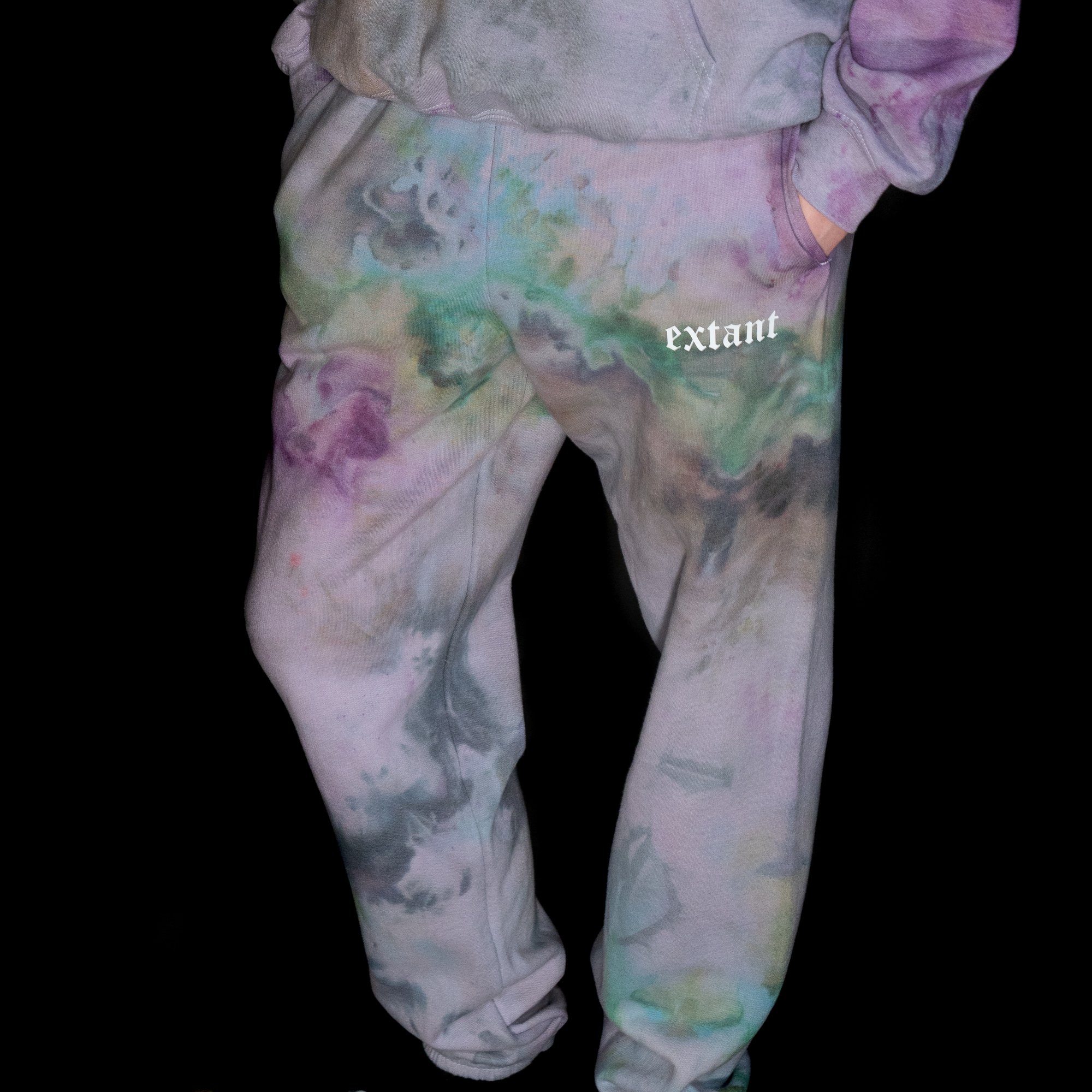 1 of 1 tie-dyed sweatpants with white Extant logo on front.